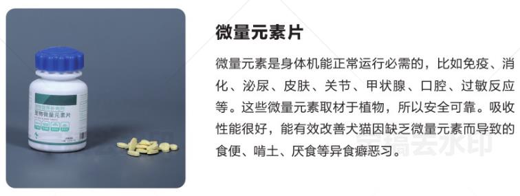 微量元素是身體機能正常運行必需的,比如免疫、消化、泌尿、皮膚、關(guān)節(jié)、甲狀腺、口腔、過敏反應(yīng)等。這些微量元素取材于植物,所以安全可靠。吸收性能很好,能有效改善犬貓因缺乏微量元素而導(dǎo)致的食便、啃土、厭食等異食癖惡習(xí)。