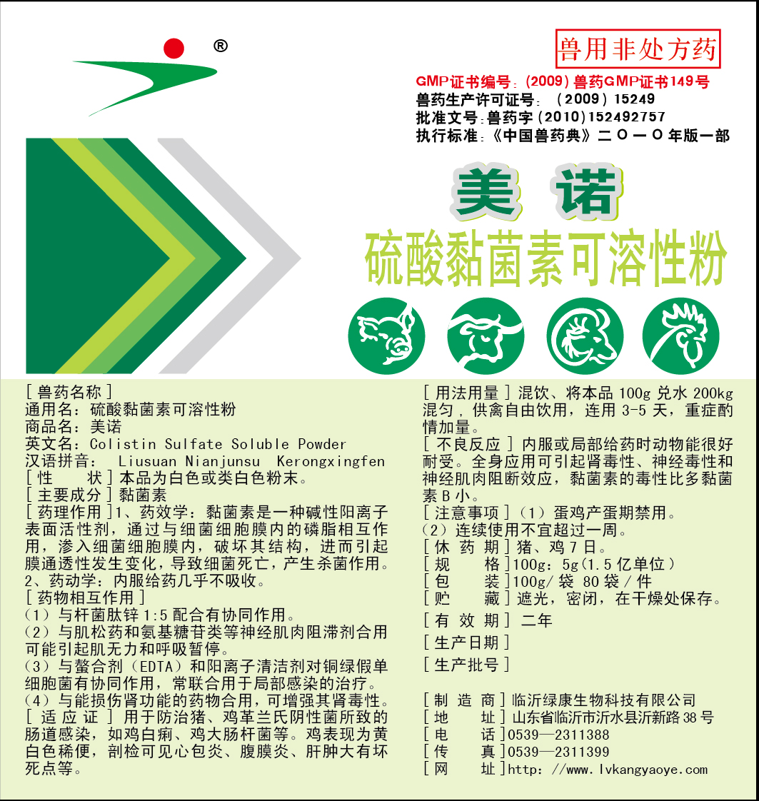【適應癥】對革蘭氏陰性菌所致的腸道感染有效,主要用于防治由大腸桿菌、沙門氏菌,各種厭氧菌引起的感染,雞表現為黃白色稀便,剖撿可見心包炎、腹膜炎、肝腫大有壞死點等。